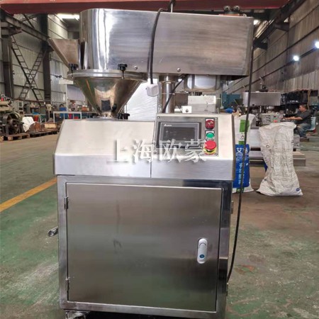 本機(jī)有送料機(jī)構(gòu)、壓片機(jī)構(gòu)、液壓機(jī)構(gòu)、機(jī)架和電氣控制等部件組成,送料,壓片、制粒均采用變頻無級(jí)調(diào)速,油泵壓力可調(diào),成品細(xì)度可以通過更換不同的篩網(wǎng)獲得。改進(jìn)制粒轉(zhuǎn)籠,增加了顆粒的成品率。本機(jī)裝拆、清洗方便,與物料接觸部分皆為不銹鋼制作。產(chǎn)品符合GMP要求。物料由頂部送料漏斗加入,經(jīng)兩壓輪強(qiáng)制擠壓成片狀后進(jìn)入下部制粒室,在制粒室中片狀物料被制粒刀片打碎,然后進(jìn)入整粒室,直至顆粒小于或等于網(wǎng)孔徑,顆粒通過網(wǎng)篩到盛料托盤。所需要顆粒大小可以通過調(diào)整篩網(wǎng)大小來決定。